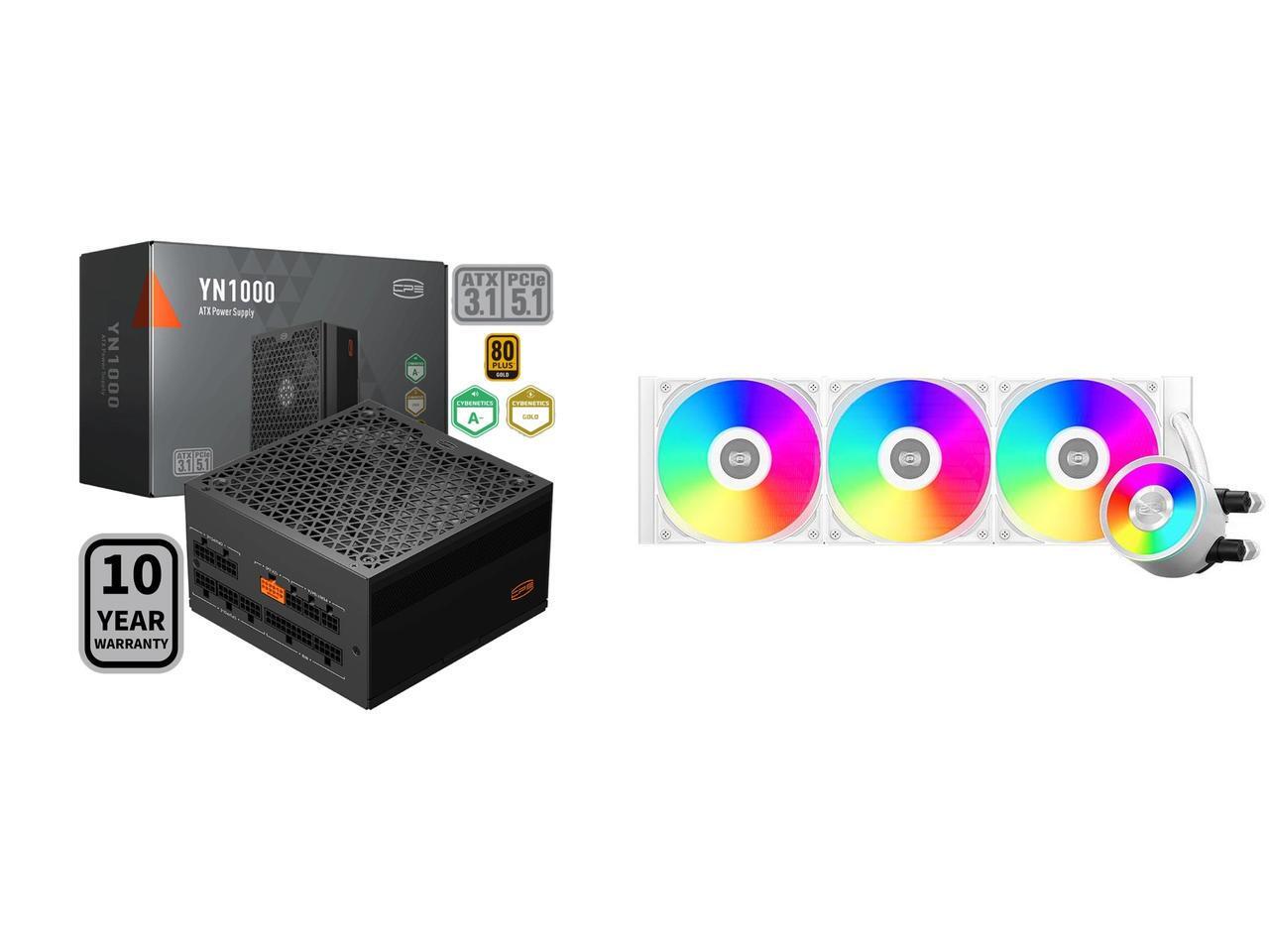 PCCOOLER CPS YN1000 Fully Modular Power Supply, 80 PLUS Gold 1000W PSU, 12V-2x6 Cable, ATX 3.1 & PCIe 5.1 Ready, 105°C Rated Japanese Capacitors, ECO Mode, 135mm FDB Fan, 10 Years Warranty and 1 x PCCOOLER CPS DA360 Pro ARGB AIO CPU Liquid Cooler, 360mm Radiator, 300W TDP, 360° Rotatable Waterblock, Infinity Halo ARGB Effect, for Intel LGA20XX/1851/1700/1200/115X & AMD AM5/AM4, White