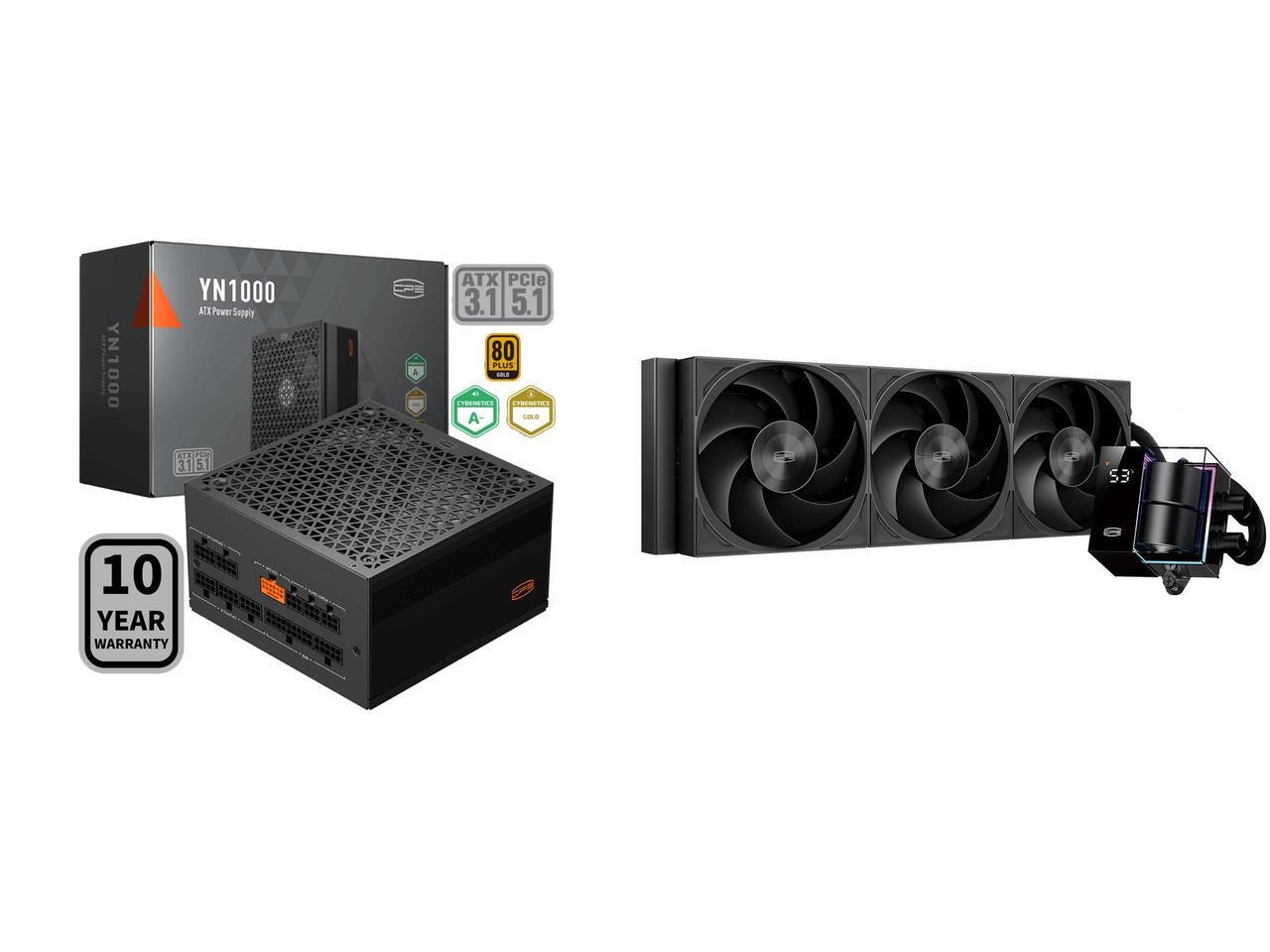 PCCOOLER CPS YN1000 Fully Modular Power Supply, 80 PLUS Gold 1000W PSU, 12V-2x6 Cable, ATX 3.1 & PCIe 5.1 Ready, 105°C Rated Japanese Capacitors, ECO Mode, 135mm FDB Fan, 10 Years Warranty and 1 x PCCOOLER CPS DS360Pro Digital AlO CPU Liquid Cooler, 360mm Radiator, 310W TDP, ARGB LEDs & Digital Display, Aluminum Pump Cover, for Intel LGA20XX/1851/1700/1200/115X & AMD AM5/AM4, Black