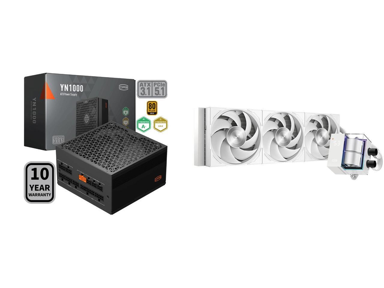 PCCOOLER CPS YN1000 Fully Modular Power Supply, 80 PLUS Gold 1000W PSU, 12V-2x6 Cable, ATX 3.1 & PCIe 5.1 Ready, 105°C Rated Japanese Capacitors, ECO Mode, 135mm FDB Fan, 10 Years Warranty and 1 x PCCOOLER CPS DS360Pro Digital AlO CPU Liquid Cooler, 360mm Radiator, 310W TDP, ARGB LEDs & Digital Display, Aluminum Pump Cover, for Intel LGA20XX/1851/1700/1200/115X & AMD AM5/AM4, White
