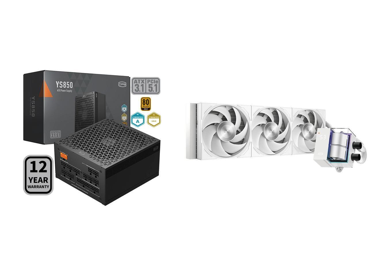 PCCOOLER CPS YS850 Fully Modular Power Supply, 80 PLUS Gold 850W PSU, 12V-2x6 Cable, ATX 3.1 & PCIe 5.1 Ready, 105°C Rated Japanese Capacitors, ECO Mode, 135mm FDB Fan, 12 Years Warranty and 1 x PCCOOLER CPS DS360Pro Digital AlO CPU Liquid Cooler, 360mm Radiator, 310W TDP, ARGB LEDs & Digital Display, Aluminum Pump Cover, for Intel LGA20XX/1851/1700/1200/115X & AMD AM5/AM4, White