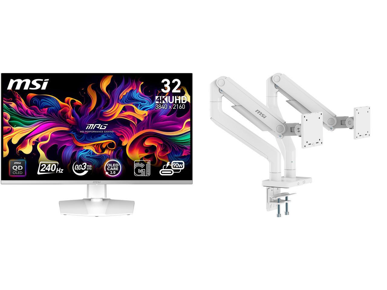 MSI 32" UHD 4K 240Hz AMD FreeSync Premium Pro & G-Sync Compatible 0.03ms HDR400 USB-C white OLED Gaming Computer Monitor with Height Adjustable, Pivot, Swivel & Tilt Stand MPG 321URXW QD-OLED MSI MAG MT201DW - Premium Heavy Duty Dual Monit