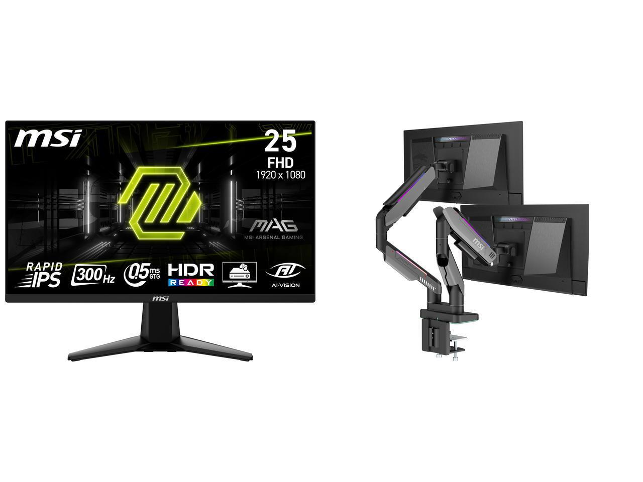 MSI 24" (24.5" viewable) Full HD 300Hz IPS with AMD FreeSync Premium 0.5ms HDR Ready Ai vision Gaming Computer Monitor MAG 255XF MSI MPG MT201DR V2 - Premium RGB Dual Monitor Stand Arms, 17-35" Support, VESA Compatible, Adjustable Heavy Dut