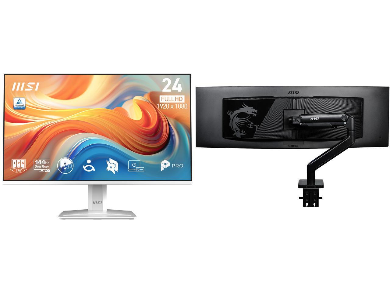 MSI 24" Full HD 144Hz IPS with Adaptive-Sync 1ms HDR Ready Built-in Speakers white computer monitor for both work and gaming MP243W E14 MSI MAG MT201 - Premium Heavy Duty Single Monitor Stand Arm, Supports 17-49" Screens and 44 lbs, VESA C