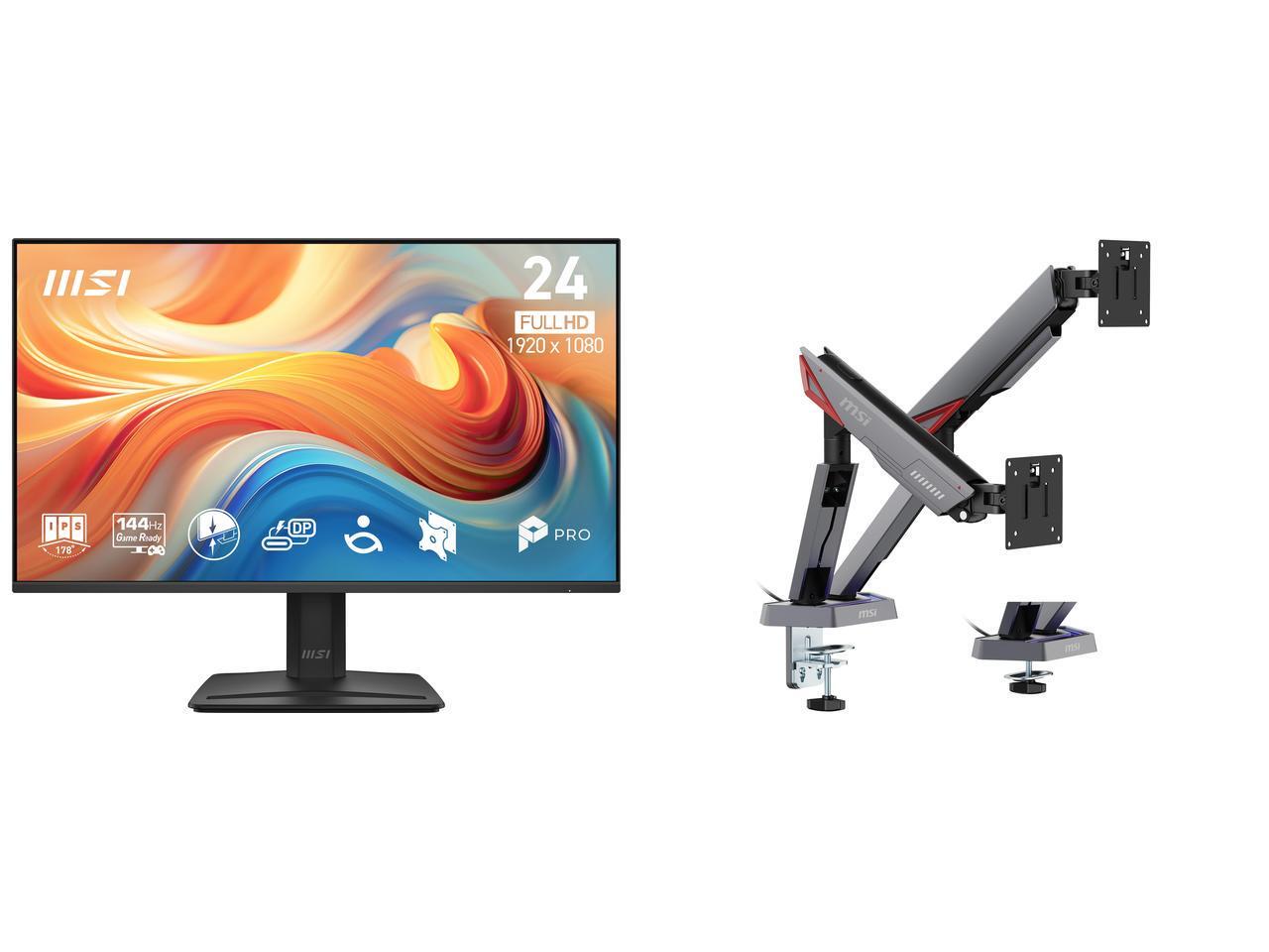 MSI 24" (23.8" viewable) Full HD 144Hz IPS AMD FreeSync (Adaptive Sync) 1ms USB-C Built-in Speaker Computer Monitor for both Work and Gaming PRO MP242 E14C MSI MPG MT161DR - Premium RGB Dual Monitor Stand Arms, 17-38" Support, VESA Compatib