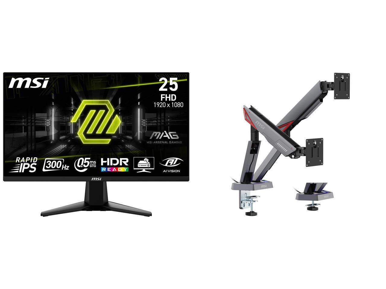 MSI 24" (24.5" viewable) Full HD 300Hz IPS with AMD FreeSync Premium 0.5ms HDR Ready Ai vision Gaming Computer Monitor MAG 255XF MSI MPG MT161DR - Premium RGB Dual Monitor Stand Arms, 17-38" Support, VESA Compatible, Adjustable Spring Assis