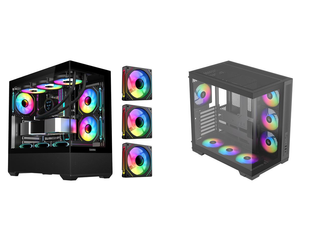 SAMA SV02 ATX Computer Gaming PC Case Mid Tower Black with 3 ARGB Fans Pre-Installed, Tempered Glass Transparent Side Panel,BTF Back Plug Motherboard Design and 1 x SAMA V52 ATX Mid Tower PC Case, Dual-Chamber Panoramic Tempered Glass Gaming Case, Back-Connect ATX Support, Type-C USB 3.2, Supports 420mm GPU & 360mm Radiator, 7 ARGB PWM Fans Included, Black