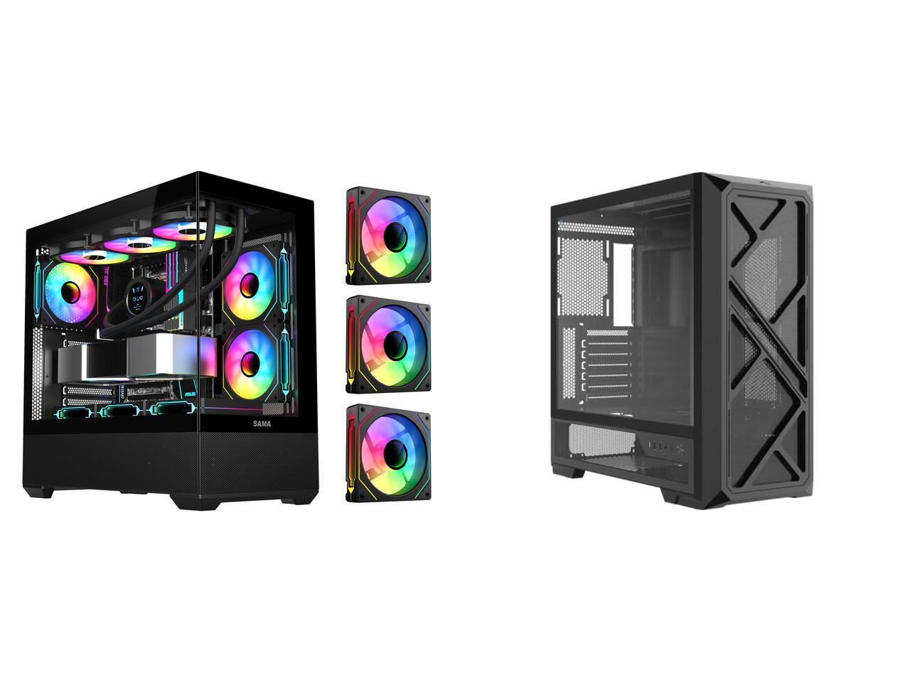 SAMA SV02 ATX Computer Gaming PC Case Mid Tower Black with 3 ARGB Fans Pre-Installed, Tempered Glass Transparent Side Panel,BTF Back Plug Motherboard Design and 1 x SAMA S41 Mid-Tower PC Case, 4 x 120mm ARGB Fans, Pre-Installed ARGB HUB, 4mm Tempered Glass, USB3.1 Type-C & USB 3.0 Ports, 7 Slots, Supports ATX / M-ATX / ITX, 360mm Water Cooling, Black