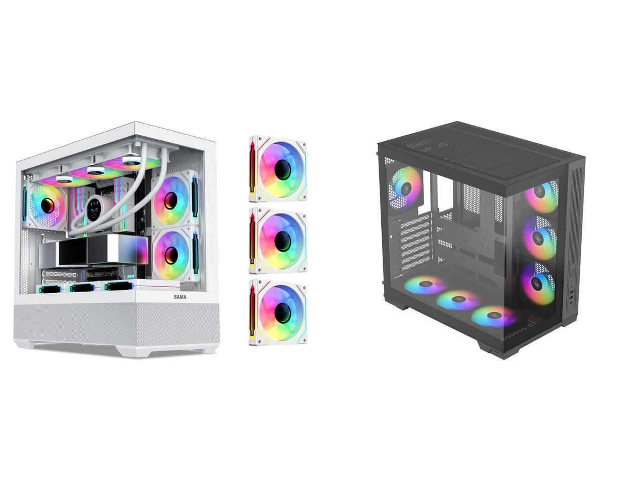 SAMA SV02 Dual USB3.0 and Type C Tempered Glass ATX Mid Tower Gaming PC Computer Case, 3 Addressable RGB Fans Pre-Installed, Support BTF Back Plug Motherboard and 1 x SAMA V52 ATX Mid Tower PC Case, Dual-Chamber Panoramic Tempered Glass Gaming Case, Back-Connect ATX Support, Type-C USB 3.2, Supports 420mm GPU & 360mm Radiator, 7 ARGB PWM Fans Included, Black