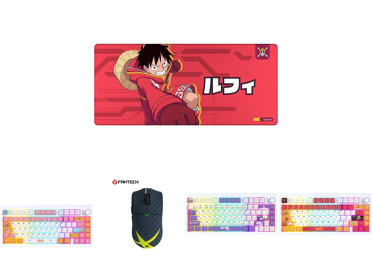 FANTECH One Piece Edition Luffy Gaming mousepad, MP905 Deskmat, Wear-resistant, waterproof, and slip-resistant rubber mat with a stylish design, 36*16*0.2 inch mouse pad, Red and 1 x FANTECH MK921 Gaming Mechanical Keyboard,One Piece Edition, Wireless/Wired/BT Connection ,RBG Controls, 80 Keys, USB-C Interface, White Shaft, White pink,Nami and 1 x Fantech One Piece Zoro Edition Wireless Gaming Mouse, PixArt PAW3311 Sensor, 57g Lightweight, Tri-Mode Connectivity, RGB Charging Dock, 12000 DPI for PC & Mac, WG13E Deep Blue and 1 x FANTECH MK921 Gaming Mechanical Keyboard,One Piece Edition, Wireless/Wired/BT Connection ,RBG Controls, 80 Keys, USB-C Interface, White Shaft, White Purple,Gear5 and 1 x FANTECH MK921 Gaming Mechanical Keyboard,One Piece Edition, Wireless/Wired/BT Connection ,RBG Controls, 80 Keys, USB-C Interface, White Shaft, White red,Luffy