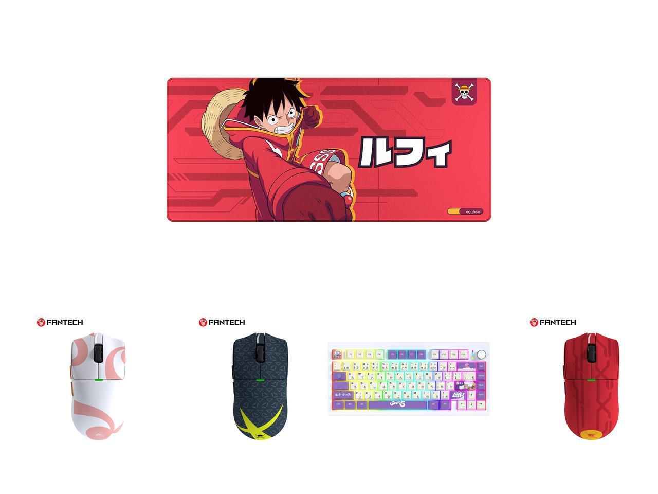 FANTECH One Piece Edition Luffy Gaming mousepad, MP905 Deskmat, Wear-resistant, waterproof, and slip-resistant rubber mat with a stylish design, 36*16*0.2 inch mouse pad, Red and 1 x Fantech One Piece Nami Edition Wireless Gaming Mouse, PixArt PAW3311 Sensor, 57g Lightweight, Tri-Mode Connectivity, RGB Charging Dock, 12000 DPI for PC & Mac, WG13E PINK and 1 x Fantech One Piece Zoro Edition Wireless Gaming Mouse, PixArt PAW3311 Sensor, 57g Lightweight, Tri-Mode Connectivity, RGB Charging Dock, 12000 DPI for PC & Mac, WG13E Deep Blue and 1 x FANTECH MK921 Gaming Mechanical Keyboard,One Piece Edition, Wireless/Wired/BT Connection ,RBG Controls, 80 Keys, USB-C Interface, White Shaft, White Purple,Gear5 and 1 x Fantech One Piece Luffy Edition Wireless Gaming Mouse, PixArt PAW3311 Sensor, 57g Lightweight, Tri-Mode Connectivity, RGB Charging Dock, 12000 DPI for PC & Mac, WG13E Red