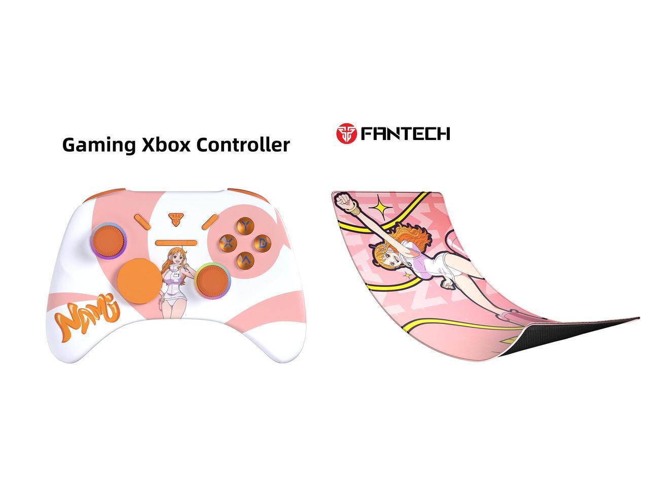 FANTECH WGPI5V2A Nami Gaming Controller, One Piece Edition, Wireless Tri-Mode (2.4G/Bluetooth 5.0/Wired),Hall Effect Trigger Buttons, Four-Level Vibration, 1000Hz Polling Rate, Pink and 1 x FANTECH MP905 Gaming Deskmat, One Piece Edition, Wear-resistant, waterproof, and slip-resistant rubber mat with a stylish design, 16*3.3*3.3inch mouse pad, Nami-Pink