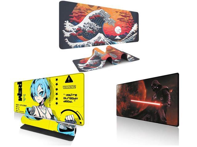 Alpha Fit Orange Sunset Great Wave Gaming Mouse Pad XXL (35.4" x 15.7") - Warm Golden Hour Japanese Art Desk Mat - Lofi Aesthetic Extended Pad and 1 x Alpha Fit Anime Gaming Mouse Pad XXL (35.4" x 15.7") - Cyberpunk Blue Haired Girl - Large Mouse Pad Extended - Extra Large Gaming Mouse Pads Yellow Caution Style - 07 and 1 x Alpha Fit Starwar Gaming Mouse Pad XXL (31.5" x 11.8") - Star Wars Themed Large Mouse Pad - Extra Large Gaming Mouse Pads with Non-Slip Rubber Base & Stitched Edges for Sci-Fi Setup