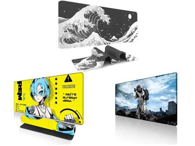 Alpha Fit Black & White Great Wave Gaming Mouse Pad XXL (35.4" x 15.7") - Monochrome Ink Wash Japanese Art Desk Mat - Minimalist Setup with Stitched Edges and 1 x Alpha Fit Anime Gaming Mouse Pad XXL (35.4" x 15.7") - Cyberpunk Blue Haired Girl - Large Mouse Pad Extended - Extra Large Gaming Mouse Pads Yellow Caution Style - 07 and 1 x Alpha Fit Star Wars Gaming Mouse Pad XXL (31.5" x 11.8") - Imperial Stormtrooper & Star Destroyer Battle Art - Large Extended Desk Mat - Non-Slip Rubber Base for PC & Laptop Gaming Setup