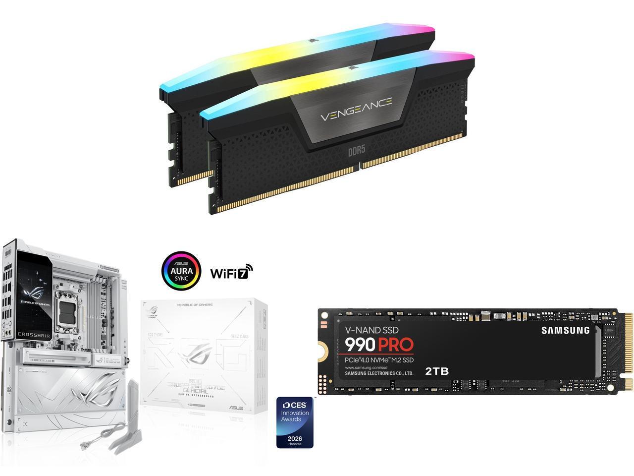 CORSAIR Vengeance RGB 96GB (2 x 48GB) 288-Pin PC RAM DDR5 7200 (PC5 57600) Desktop Memory Model CMH96GX5M2N7200C40 ASUS ROG Crosshair X870E Glacial, AMD E-ATX motherboard, 24+2+2 power stages, DDR5 slots, two PCIe 5.0 x16 SafeSlots, seven M