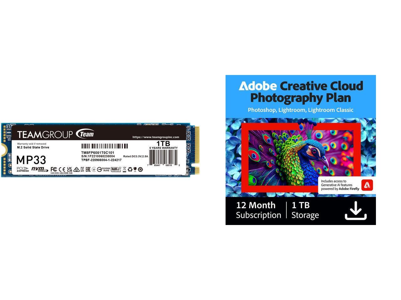 Team Group MP33 M.2 2280 1TB PCIe 3.0 x4 with NVMe 1.3 3D NAND Internal Solid State Drive (SSD) TM8FP6001T0C101 Adobe - Creative Cloud Photography Plan 1TB (1-Year Subscription) - Mac, Windows, iOS [Digital]