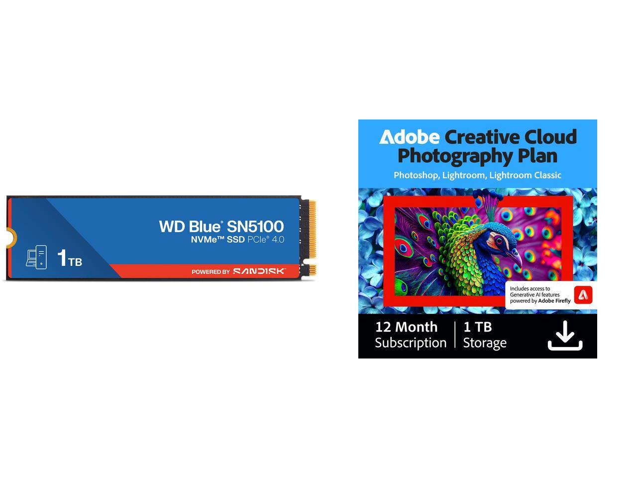 WD Blue SN5100 1TB NVMe SSD, PCIe Gen 4.0, up to 7,100 MB/s read speeds Adobe - Creative Cloud Photography Plan 1TB (1-Year Subscription) - Mac, Windows, iOS [Digital]