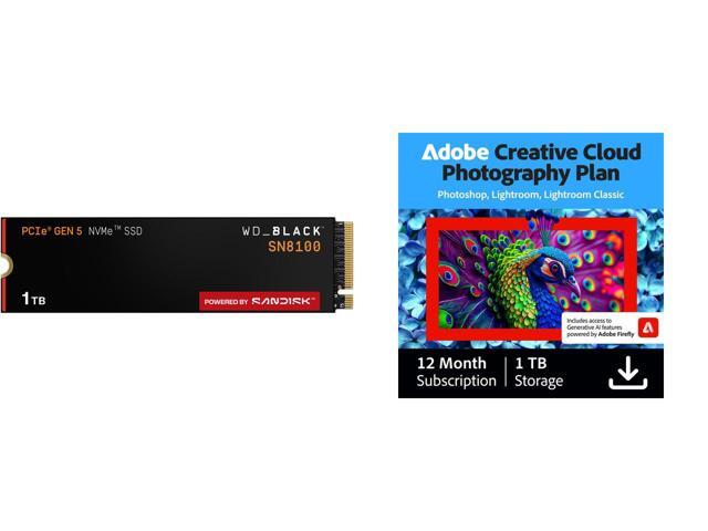 WD_BLACK 1TB SN8100 NVMe SSD Internal Solid State Drive - Gen 5 PCIe 5.0x4, M.2 2280, Seq. Read Speeds Up to 14,900 MB/s, Best for AI Applications, Gaming, and Video Editing - WDS100T1X0M Adobe - Creative Cloud Photography Plan 1TB (1-Year