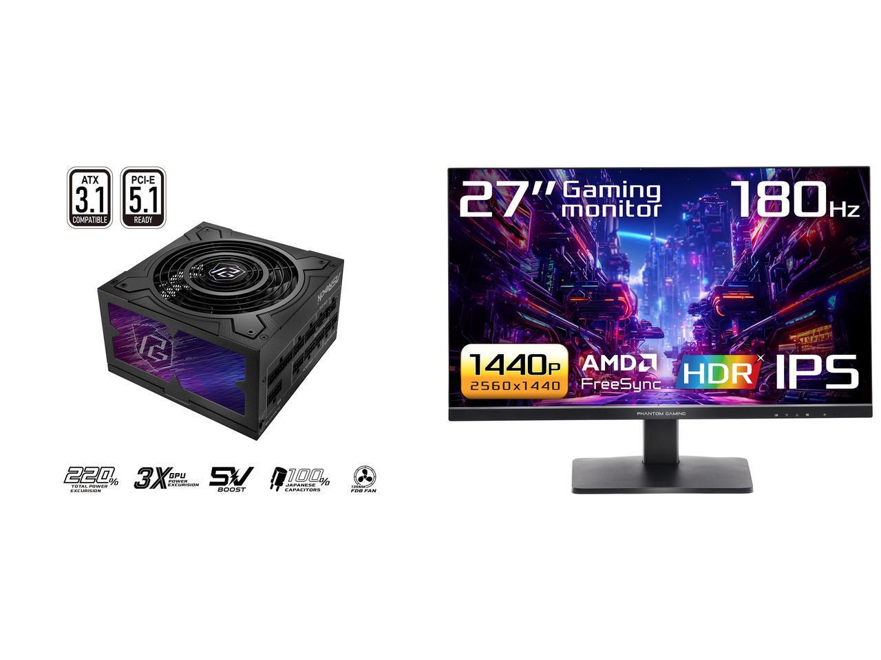 ASRock Phantom Gaming PG-850G 850W 80 PLUS GOLD & Cybenetics PLATINUM Full Modular Power Supply, ATX3.1 & PCIe5.1 Ready with Dual Color 12V-2x6 Cable, 10 Years Warranty ASRock Phantom Gaming 27" QHD 2K 1440P 180Hz IPS with AMD FreeSync (AMD
