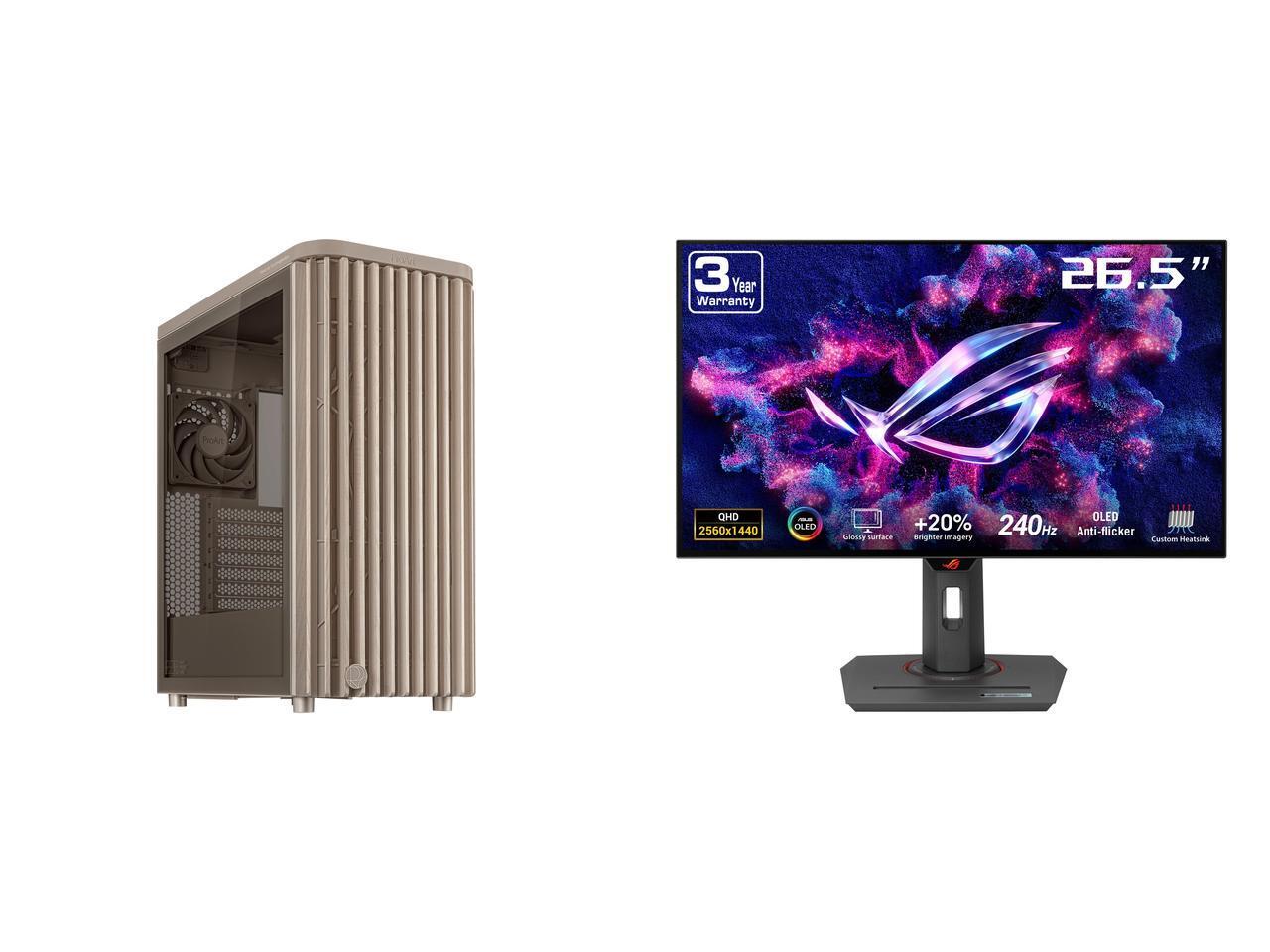 ASUS ProArt PA401 Wood Edition Beige ATX case features a tempered glass panel, supports GPUs up to 315mm, 240mm radiator, 160x32mm fans, button lock, and detachable PSU bracket ASUS ROG Strix 27" QHD 2K 1440P 240Hz with AMD FreeSync Premium
