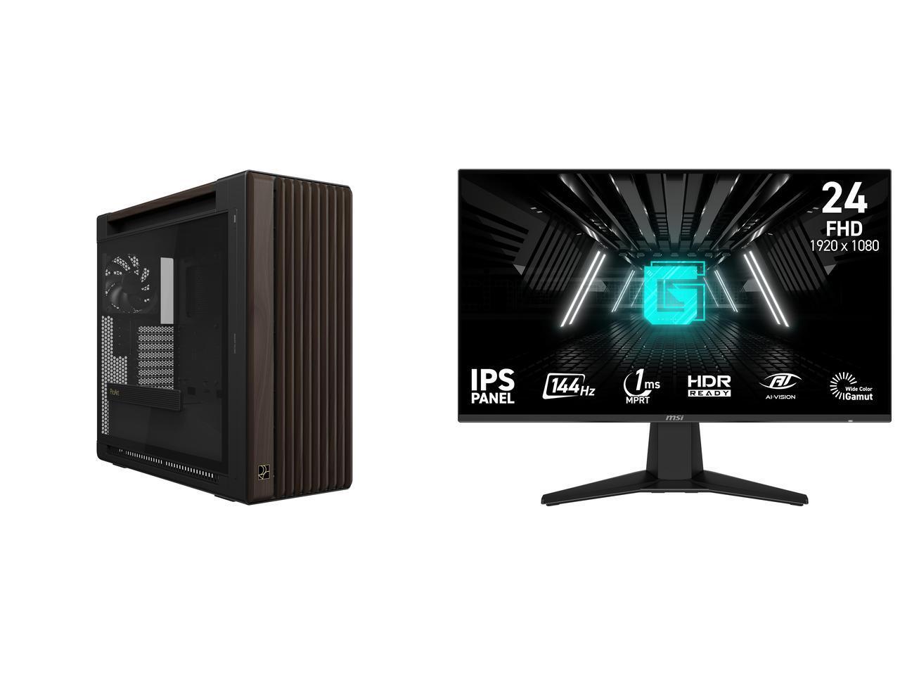 ASUS ProArt PA602 Wood Edition Modern Black E-ATX Mid-Tower Case with Tempered Glass, Supports 440mm GPUs, 420mm Radiators, Includes One 140mm and Two 200mm Pre-Installed Fans. MSI 24" (23.8" viewable) Full HD 144Hz IPS with Adaptive-Sync 1