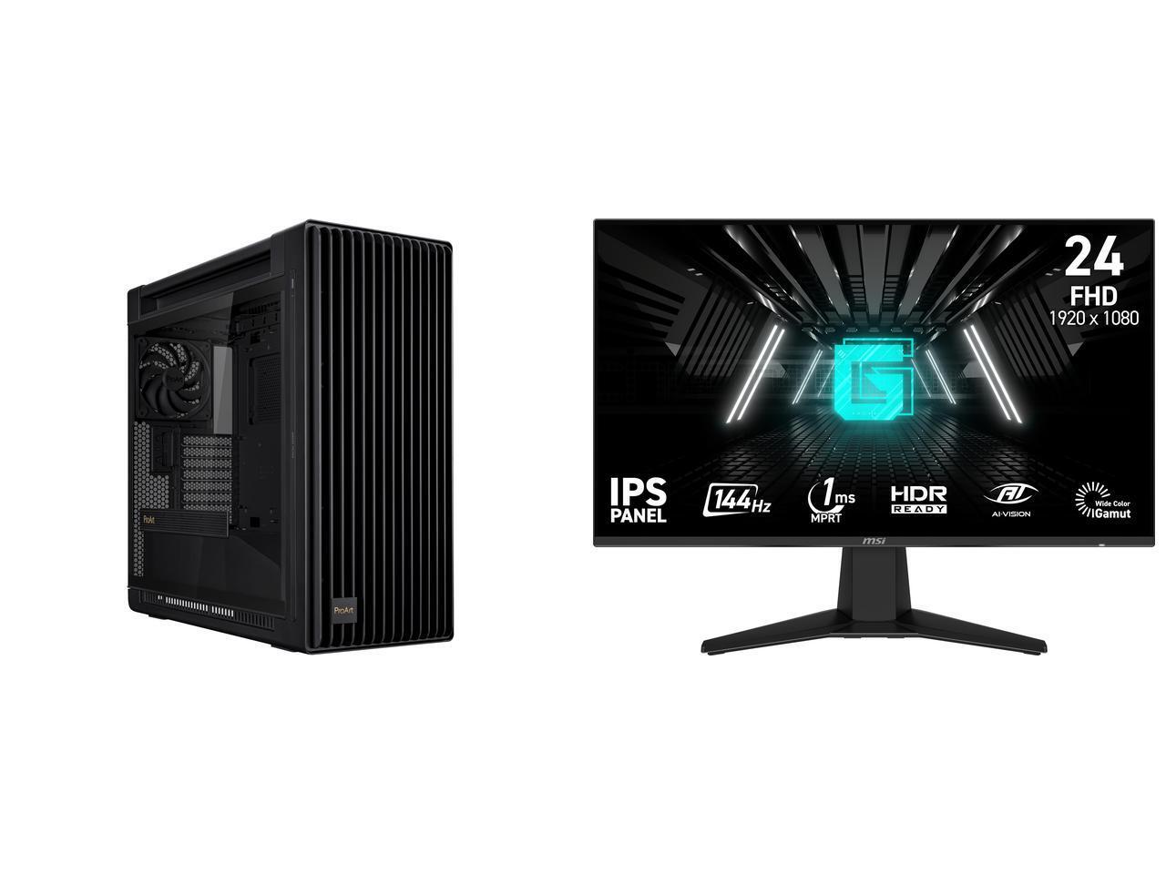 ASUS ProArt PA602 E-ATX Computer Case, 420mm radiator support, Dual 200mm built-in fans, front panel IR dust indicator, power lock latch, tool-less PCIe mounting & GPU Holder, 20Gbps USB-C front I/O MSI 24" (23.8" viewable) Full HD 144Hz IP
