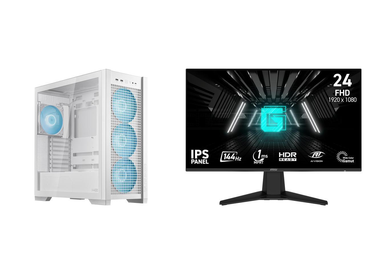 ASUS TUF Gaming GT302 ARGB White Edition ATX Mid-Tower Case Four 140 x 28 mm ARGB fans for high airflow and static pressure, interchangeable side panel, hidden-connector motherboard support MSI 24" (23.8" viewable) Full HD 144Hz IPS with Ad