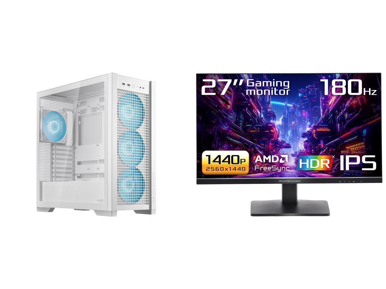 ASUS TUF Gaming GT302 ARGB White Edition ATX Mid-Tower Case Four 140 x 28 mm ARGB fans for high airflow and static pressure, interchangeable side panel, hidden-connector motherboard support ASRock Phantom Gaming 27" QHD 2K 1440P 180Hz IPS w