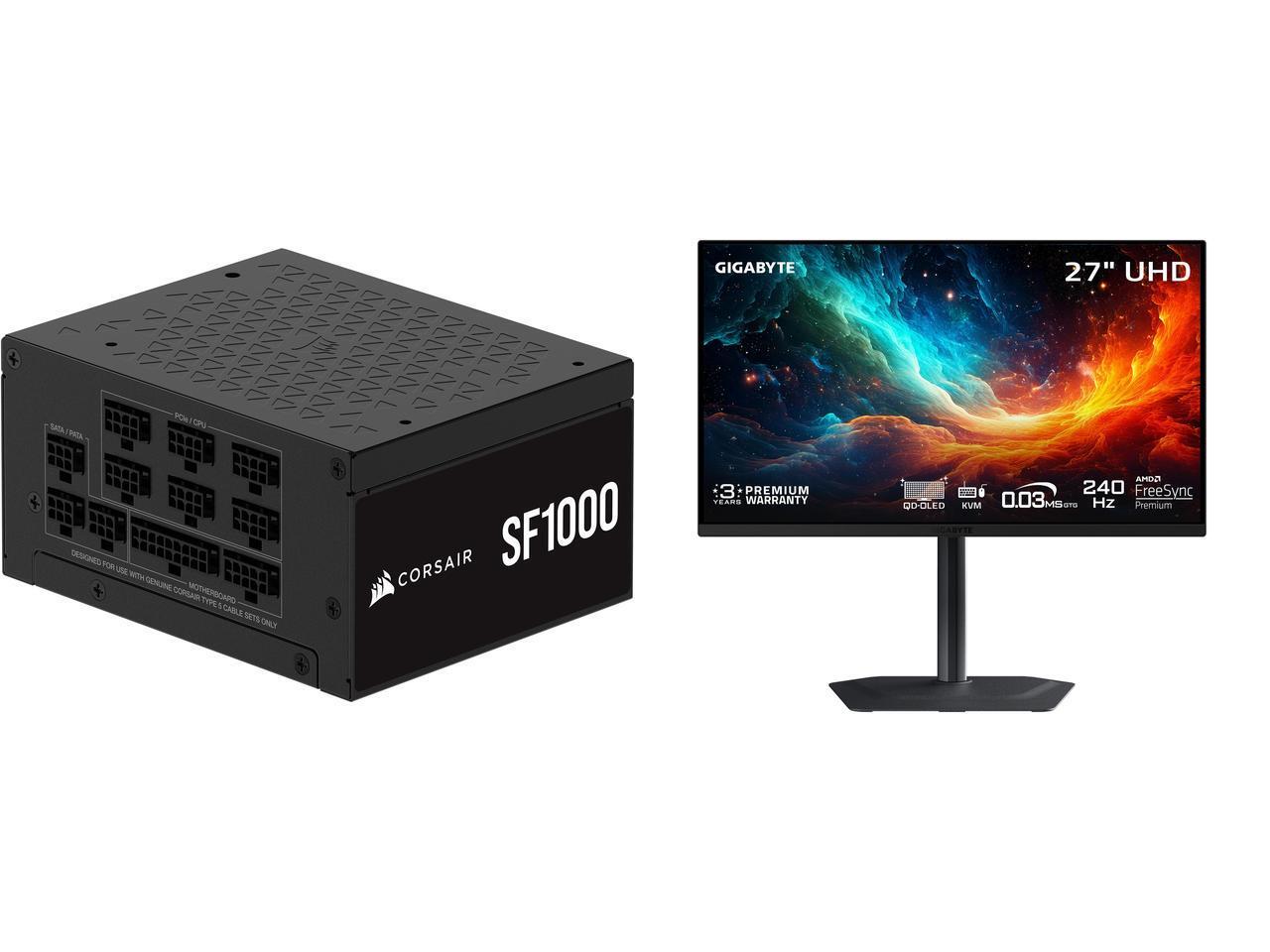 Corsair SF Series (2024) SF1000, 80 PLUS Platinum, Fully Modular SFX Power Supply, CP-9020257-NA GIGABYTE 27" UHD 4K 240Hz with AMD FreeSync Premium Pro &, G-SYNC Compatible HDR400 USB-C KVM OLED Gaming Computer Monitor with Height adjustab
