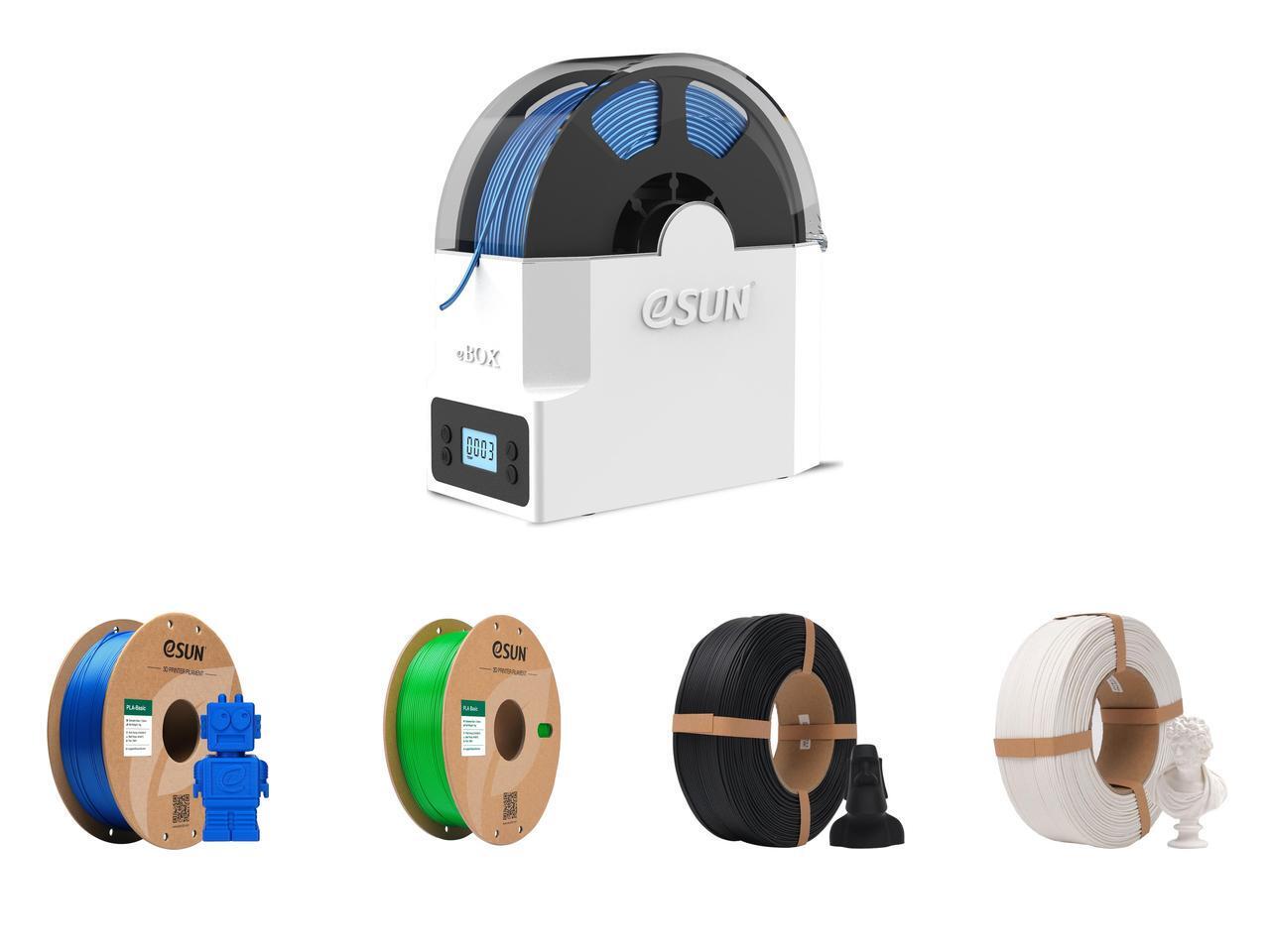 eSUN eBOX Lite Upgraded 3D Printing Filament Dryer Box, Filament Storage Box, Spool Holder for Keeping 3D Printing Filament from Moist and Keeping Filaments Dehydrating, US Plug and 1 x eSUN PLA Basic Filament 1.75mm, 3D Printer Filament High Speed PLA for Fast Printing, 1KG Spool (2.2 LBS) 3D Printing Filament for High Speed 3D Printers,Blue and 1 x eSUN PLA Basic Filament 1.75mm, 3D Printer Filament High Speed PLA for Fast Printing, 1KG Spool (2.2 LBS) 3D Printing Filament for High Speed 3D Printers, Green and 1 x eSUN Matte PLA Refilament 1.75mm, Matte 3D Printer Refill PLA Filament, 1KG Spoolless 3D Printing Filament for 3D Printers, Deep Black and 1 x eSUN Matte PLA Refilament 1.75mm, Matte 3D Printer Refill PLA Filament, 1KG Spoolless 3D Printing Filament for 3D Printers, Milky White