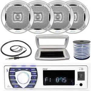 Pyle PLRMR23BTW Single-DIN Bluetooth Marine USB/AUX MP3/SD AM/FM Radio Stereo Receiver W/White Cover, 4x Pyle PLMR22WT 2.25' 10 Watt Max Power Full Range Off-Road White Speakers W/Wire, Radio Antenna