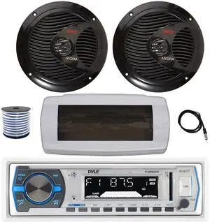 Pyle PLMRB29W Single DIN Bluetooth Marine MP3 AM/FM Stereo Receiver with White Cover, 22" Radio Antenna, Wire, 2x 5.25" 180 Watt Max 2-Way Waterproof Boat Audio Speakers (Black)