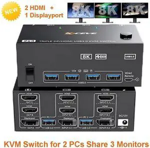 8K 2 Displayport + HDMI USB 3.0 KVM Switch 3 Monitors 2 Computers, 8K@60Hz 4K@144Hz 2 Displayport + HDMI Triple Monitor KVM Switch with 4 USB 3.0 Ports, KVM Triple Monitor Keyboard Mouse Switcher