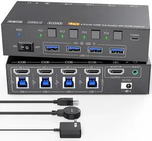 USB 3.0 KVM Switch HDMI 4 Port Support 4K @60Hz 2K @120Hz Simulation EDID, HDMI USB3.0 Switch for 4 Computers Share 1 Monitor with 4 USB 3.0 Port, with Desktop Controller and KVM Cables