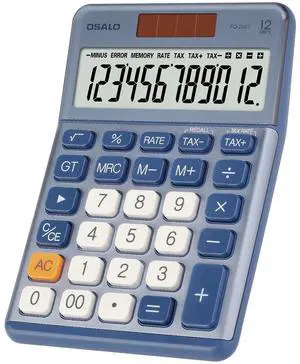 SOEWIOU Office Small Calculator Desktop with Tax+/- for Tax Calculation, 12 Digit Large LCD Display, Solar Battery Power, Durable Portable Design, Financial Accounting Business Home Use(OS-200T-Blue)