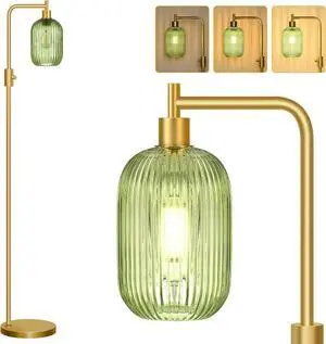 Upgraded Dimmable Glass Floor Lamp for Living Room, Modern Gold Standing Lamp with Green Ribbed Glass Lampshade & Knob Dimmer, Arc Tall Lamp for Bedroom Office Reading Room, 2700K Led Bulb Included