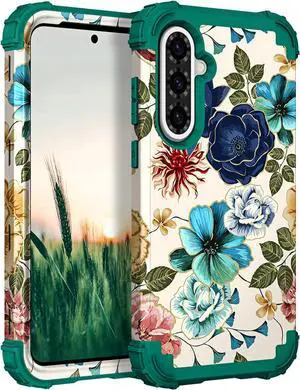 for Galaxy A36 5G Case Heavy Duty Shockproof Protection Soft Silicone Rubber Bumper+Hard Plastic Hybrid Protective Case for Galaxy A36/A56 5G (6.7 Display) 2025 - Teal Flowers