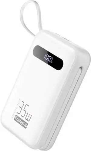 EnergyQC 20000mAh Portable Charger, 35W PD 3.0+QC 4.0 Fast Charging Power Bank with Built-in Lightning & USB-C in&Out Cables, Travel Battery Pack for iPhone 16/15/14/13, Samsung, iPad, Android, White