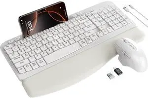 SABLUTE Wireless Keyboard and Mouse Combo, Ergonomic Wave Keys, Cushioned Palm Rest, Rechargeable, Phone Holder, Natural Typing, 2.4G Lag-Free, Full Size Keyboards Cordless Set for Windows/Mac, White