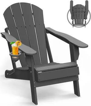 JiffyPoint Folding Adirondack Chairs, HDPE All-Weather Fire Pit Chairs with Cup Holder, Plastic Campfire Chair for Deck Backyard Patio Outdoor Poolside Porch Lawn, Grey