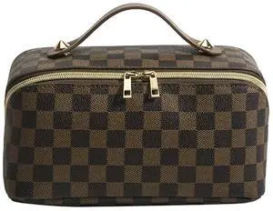 Large Capacity Travel Cosmetic Bag Plaid Checkered Makeup Bag Portable Leather Waterproof Skincare Bag with Handle and Divider for Women
