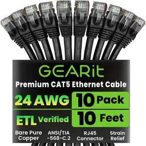 GearIt 10-Pack, Cat5e Ethernet Patch Cable 10 Feet - Snagless RJ45 Computer LAN Network Cord, Black