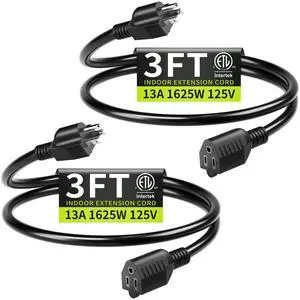 3FT (2Pack) 13A 125V 1625W ETL Listed, 16/3 Indoor Extension Cord Black, Short Extension Cord for Laptops, Coffee Makers, Office Home Appliances, 3 Prong Small Resistant Cable Flexible