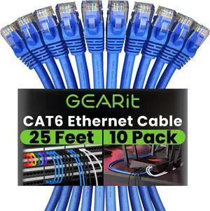 GearIT Cat 6 Ethernet Cable (10-Pack 25 Feet) Cat6 Network Patch, 10Gbps, RJ45, Snagless Cord, Gold-Plated Connectors, Internet for PC, TV, Tablet, Router, Printer, Servers, IT Data Center - Blue