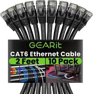 GEARit Cat 6 Ethernet Cable (10-Pack 2 Feet) Cat6 Network Patch, 10Gbps, RJ45, Snagless Cord, Gold-Plated Connectors, Internet for PC, TV, Tablet, Router, Printer, Servers, IT Data Center - Black