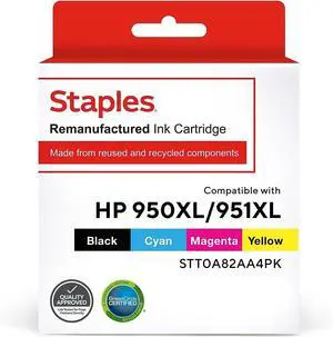 STAPLES Remanufactured Black/Cyan/Magenta/Yellow High Yield Ink Cartridges Replacement for HP 950XL/951XL, 4/Pack (STT0A82AA4PK)