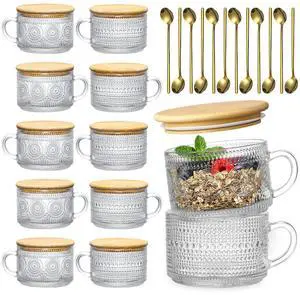12pcs Set Irish Coffee Glasses, Vintage Coffee Mugs, Overnight Oats Containers with Bamboo Lids and Spoons - 14oz Clear Embossed Glass Cups, Cute Coffee Bar Accessories, Iced Coffee Glasses