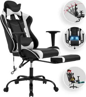 Computer Gaming Chair Office PC Ergonomic Home Executive Desk Racing Rolling Swivel Task Adjustable High-Back PU Leather with Lumbar Support Footrest Headrest Armrest Massager, White