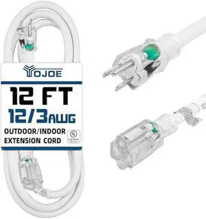YOJOE Indoor Outdoor Extension Cord with Lighted End, 3 Prong 15A Weatherproof Power Cord, 12 Gauge Heavy Duty 12 ft White Extension Cord for Garage, Garden and Home, 12/3 SJTW UL Listed