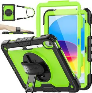 SEYMAC stock Case for iPad 10th Generation 10.9'', Full-Body Drop Protection Case with Screen Protector &360deg Rotate Hand Strap/Stand, Green+Black