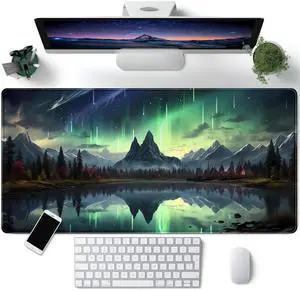 Northern Lights Desk Mat Mountains Large Mouse Pad Extended Green Aurora Borealis Desk Pad Shower Gaming Mousepad XXL 31.5 x 15.7 in Laptop Computer Mouse Keyboard Mat for Office Desk Decor